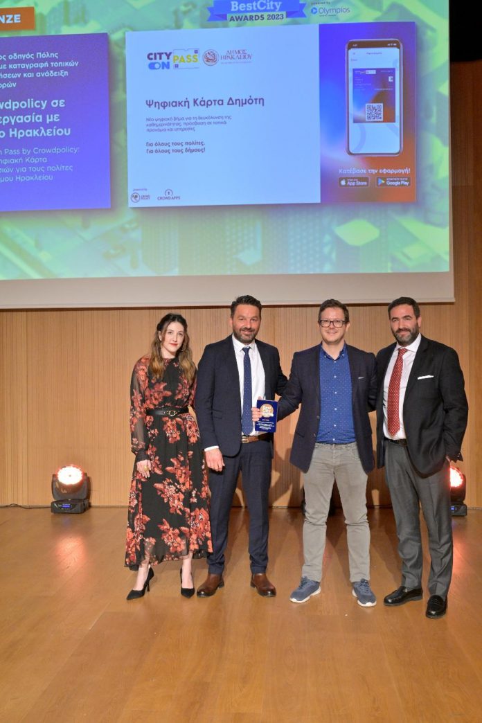 Με το Χάλκινο  βραβείο τιμήθηκε η εφαρμογή που έχει αναπτύξει η εταιρεία Crowdpolicy  για το Δήμο. Πρόκειται  για την «Ψηφιακή Κάρτα Δημότη» με την οποία οι δημότες θα μπορούν να ενημερώνονται για τις ψηφιακές υπηρεσίες και να έχουν άμεση προσωποποιημένη πρόσβαση σε υπηρεσίες χωρίς γραφειοκρατικές διαδικασίες. Η «Ανάπτυξη Αθλητισμού Ηρακλείου ΑΕ» πήρε το Χάλκινο βραβείο για την  «Πλατφόρμα Διαχείρισης Μητρώου Μελών & Συνδρομών Αθλητικών Δομών Δήμου Ηρακλείου» στο πλαίσιο της κατηγορίας «Συστήματα Διαχείρισης χώρων άθλησης, πολιτισμού́ & ψυχαγωγίας».
