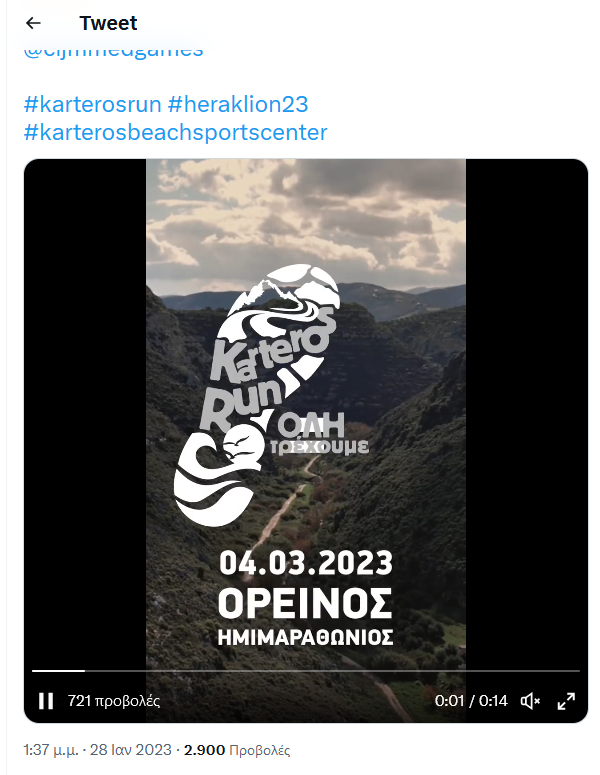Το Υφυπουργείο Αθλητισμού, ο Οργανισμός Λιμένος Ηρακλείου, το Εθνικό Αθλητικό Κέντρο Ηρακλείου και η Οργανωτική Επιτροπή «Ηράκλειο 2023», των 3ων Μεσογειακών Παράκτιων Αγώνων -έξι μήνες πριν από τη διεξαγωγή τους στο Karteros Beach Sports Center- συνδιοργανώνουν στον Καρτερό μεγάλη διήμερη αθλητική γιορτή, τους δρομικούς αγώνες ορεινού ημιμαραθωνίου (το Σάββατο 4 Μαρτίου) και των 10χλμ, 5χλμ και 1.000μ. για παιδιά (την Κυριακή 5 Μαρτίου).