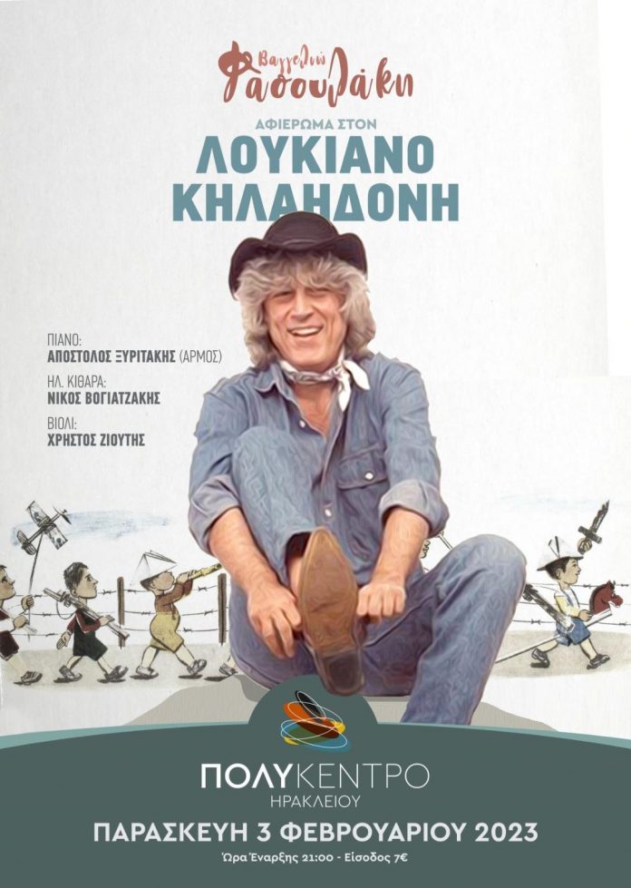Με ένα εξαιρετικό αφιέρωμα στον Λουκιανό Κηλαηδόνη από τη Βαγγελιώ Φασουλάκη και τους συνεργάτες της, συνεχίζονται οι εκδηλώσεις στο Πολύκεντρο Ηρακλείου την Παρασκευή 3 Φεβρουαρίου. Τα υπέροχα τραγούδια του μοναδικού Λουκιανού αναμένεται να συγκινήσουν και να γυρίσουν το ρολόι του χρόνου πίσω. Η βραδιά ξεκινά στις 21:00.