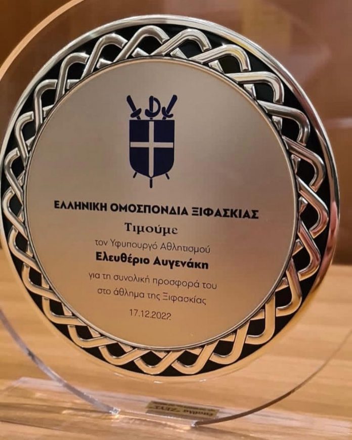 Τιμήθηκε ο Υφυπουργός Αθλητισμού, Λευτέρης Αυγενάκης, από την Ελληνική Ομοσπονδία Ξιφασκίας, στην ετήσια εκδήλωσή της με τις βραβεύσεις των καλύτερων αθλητριών, αθλητών και σωματείων για το 2022.