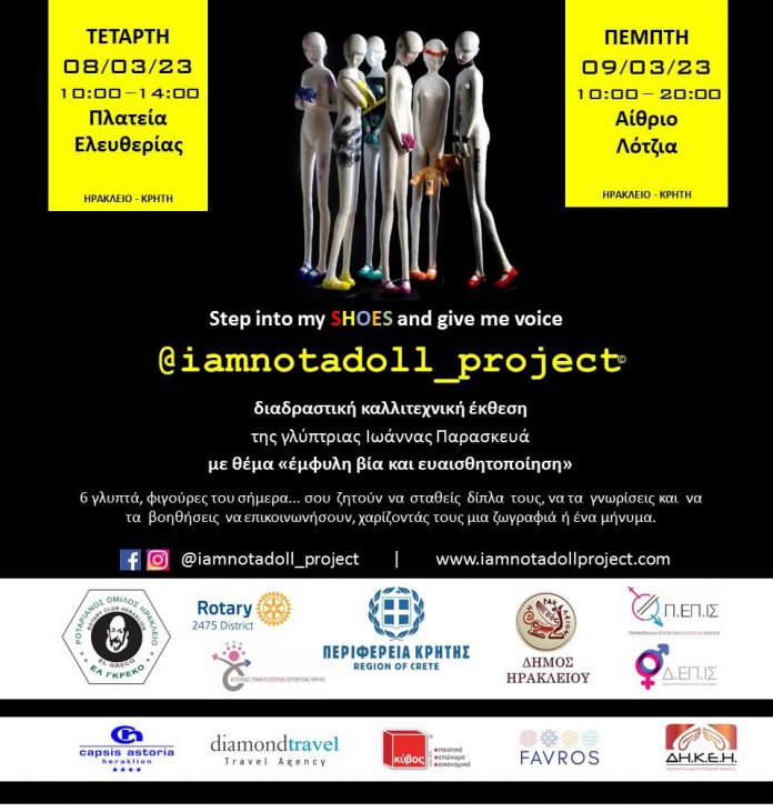 - Πέμπτη 9 Μαρτίου: 10.00 – 20.00, Δημαρχείο Ηρακλείου – Αίθριο Λότζια Διαδραστική έκθεση γλυπτών «@Ιamnotadoll_project» – «Δεν είμαι κούκλα. Δεν είμαι αντικείμενο», με τη συμμετοχή του κοινού, μαθητριών/μαθητών και φοιτητριών/φοιτητών. Η πρωτοβουλία της έκθεσης ανήκει στη γλύπτρια κ. Ιωάννα Παρασκευά, η οποία επιθυμεί να παρακινήσει τους πολίτες να εφαρμόσουν την ουσιαστική ισότητα των φύλων και τη μηδενική ανοχή τους σε κάθε μορφή έμφυλης διάκρισης, κακοποίησης και βίας στην καθημερινή τους ζωή.