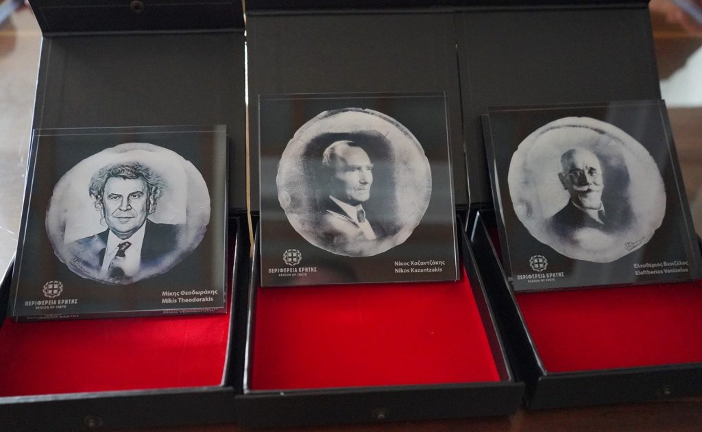 Ελευθέριος Βενιζέλος, Νίκος Καζαντζάκης και Μίκης Θεοδωράκης, τρείς κορυφαίες προσωπικότητες για την Κρήτη που με την προσφορά τους στην πολιτική, τα γράμματα και την τέχνη, αποτελούν σημείο αναφοράς για το νησί, την ιστορία του τόπου και των ανθρώπων του, απεικονίζονται στα αναμνηστικά που θα διατίθενται σε κορυφαίες προσωπικότητες που επισκέπτονται το νησί.