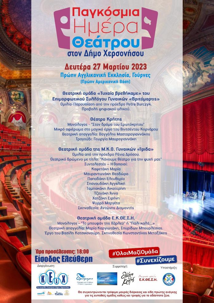 Με αφορμή τον εορτασμό της Παγκόσμιας Ημέρας Θεάτρου, στις 27 Μαρτίου, η Κοινωφελής Επιχείρηση Δήμου Χερσονήσου (Κ.Ε.Δ.Χ.) διοργανώνει εκδήλωση και προσκαλεί τους φίλους του θεάτρου να παρακολουθήσουν ομιλίες και θεατρικά δρώμενα. Συμμετέχουν ερασιτεχνικές θεατρικές ομάδες Πολιτιστικών Συλλόγων/Φορέων που δραστηριοποιούνται στον Δήμο Χερσονήσου, καθώς και επαγγελματικές θεατρικές ομάδες, με σκοπό την ανάδειξη και προβολή του έργου τους.