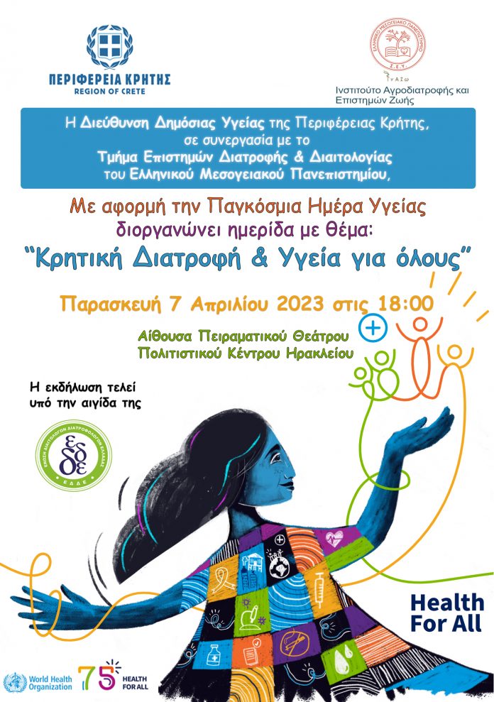 με αφορμή την Παγκόσμια Ημέρα Υγείας, διοργανώνει ημερίδα με θέμα: «Κρητική Διατροφή & Υγεία για όλους» την Παρασκευή 7 Απριλίου 2023 και ώρα 18:00