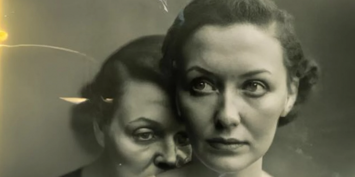 Η απόκοσμη ασπρόμαυρη εικόνα δείχνει δύο γυναίκες από διαφορετικές γενιές. Η μεγαλύτερη γυναίκα στέκεται πίσω από τη νεότερη γυναίκα και στηρίζεται με τα χέρια της πάνω της.