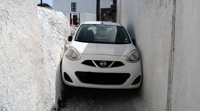 Αυτό φαίνεται δεν το γνώριζε ο οδηγός ενός ενοικιαζόμενου αυτοκινήτου που, όπως ανακοίνωσαν οι αρχές με τη σχετική φωτογραφία, σφήνωσε σε ένα στενό δρομάκι στη Σαντορίνη.