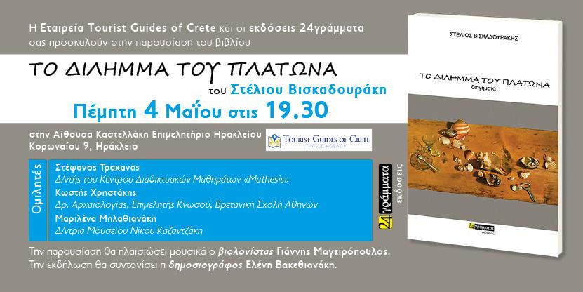 Η Εταιρεία Tourist Guides of Crete και οι Εκδόσεις 24γράμματα σας προσκαλούν στην παρουσίαση του βιβλίου του συγγραφέα Στέλιου Βισκαδουράκη «Το Δίλημμα του Πλάτωνα». Η παρουσίαση θα γίνει την Πέμπτη 4 Μαΐου 2023, στις 19.30, στην Αίθουσα Καστελλάκη-Επιμελητήριο Ηρακλείου (Κορωναίου 9, Ηράκλειο).