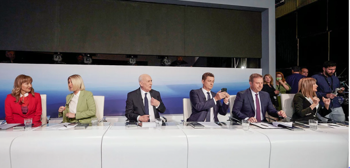 Οι Κυριάκος Μητσοτάκης, Αλέξης Τσίπρας, Νίκος Ανδρουλάκης, Δημήτρης Κουτσούμπας, Γιάνης Βαρουφάκης και Κυριάκος Βελόπουλος, βρέθηκαν «αντιμέτωποι» με τους δημοσιογράφους Μάρα Ζαχαρέα (STAR), Σία Κοσιώνη (ΣΚΑΪ), Γιώργο Παπαδάκη (ΑΝΤ1), Αντώνη Σρόιτερ (ALPHA), Παναγιώτη Στάθη (OPEN) και Ράνια Τζίμα (MEGA).