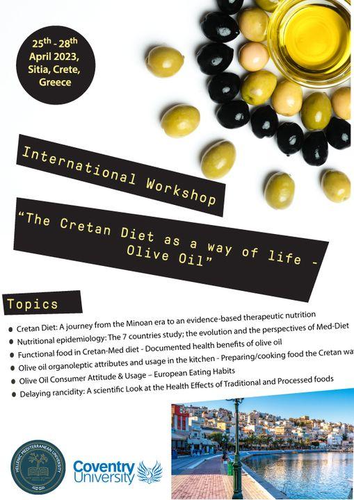 Το Ελληνικό Μεσογειακό Πανεπιστήμιο (ΕΛΜΕΠΑ), στο πλαίσιο της συνεργασίας του με τα πανεπιστήμια του Ηνωμένου Βασιλείου, διοργάνωσε από κοινού με το Πανεπιστήμιο του Coventry/ Faculty of Health and Life Sciences, από 25 έως 28 Απριλίου 2023, στο Τμήμα Επιστημών Διατροφής & Διαιτολογίας, στη Σητεία Λασιθίου, το International workshop: “The Cretan Diet as a way of life – Olive Oil”, που αφορά ένα από τα πιο εμβληματικά θέματα Ελληνικής ταυτότητας.