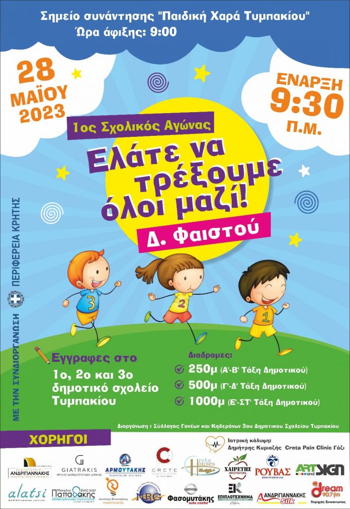 Είναι γεγονός! Ο Σύλλογος γονέων και κηδεμόνων του 3ου Δημοτικού Σχολείου Τυμπακίου διοργανώνει τον 1ο σχολικό αγώνα Δ. Φαιστού με την στήριξη της Περιφέρειας Κρήτης. Η διοργάνωση θα αποτελείται από 3 διαδρομές 250μ-500μ και 1000μ και έχουν προγραμματιστεί για το πρωινό της Κυριακής 28 Μαΐου με έναρξη του πρώτου αγώνα 250μ στις 09:30πμ για τις Α-Β τάξεις Δημοτικού, του δεύτερου αγώνα 500μ στις 10πμ για τις Γ-Δ τάξεις Δημοτικού και του τρίτου αγώνα 1000μ στις 10:30πμ για τις Ε-ΣΤ τάξης Δημοτικού. Όλοι οι αγώνες θα λάβουν μέρος στο ίδιο δρόμο με τον μεγαλύτερο αγώνα να καλύπτει τη διαδρομή μεταξύ του πάρκου δίπλα στο Τρίτο Δημοτικό Σχολείο και του πολυδύναμου Ιατρείου Τυμπακίου.