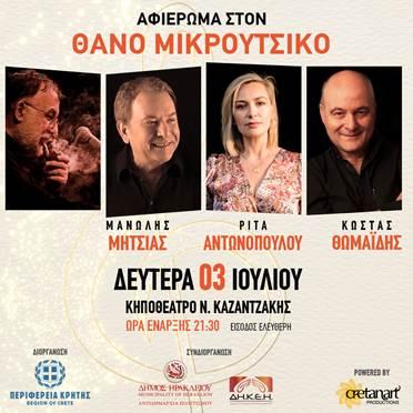 Η μουσική του Θάνου Μικρούτσικου ταξιδεύει στο Ηράκλειο της Κρήτης για μία συναυλία με τραγούδια από την πλούσια πορεία του. Τραγούδια που όλοι αγαπήσαμε θα ερμηνευτούν από σημαντικούς τραγουδιστές και σπουδαίους μουσικούς.