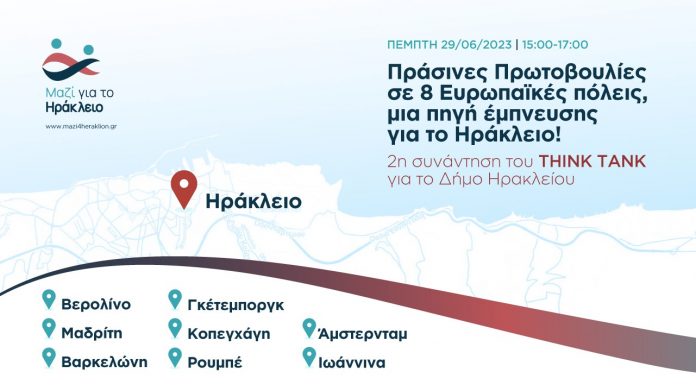 Η δεύτερη συνάντηση του Think Tank, της «δεξαμενής σκέψης και ιδεών» για το Ηράκλειο, θα πραγματοποιηθεί την Πέμπτη 29 Ιουνίου και ώρα 15.00-17.00 και το θέμα συζήτησης θα είναι “Πράσινες Πρωτοβουλίες σε 8 Ευρωπαϊκές πόλεις, Μια πηγή έμπνευσης για το Ηράκλειο!”.
