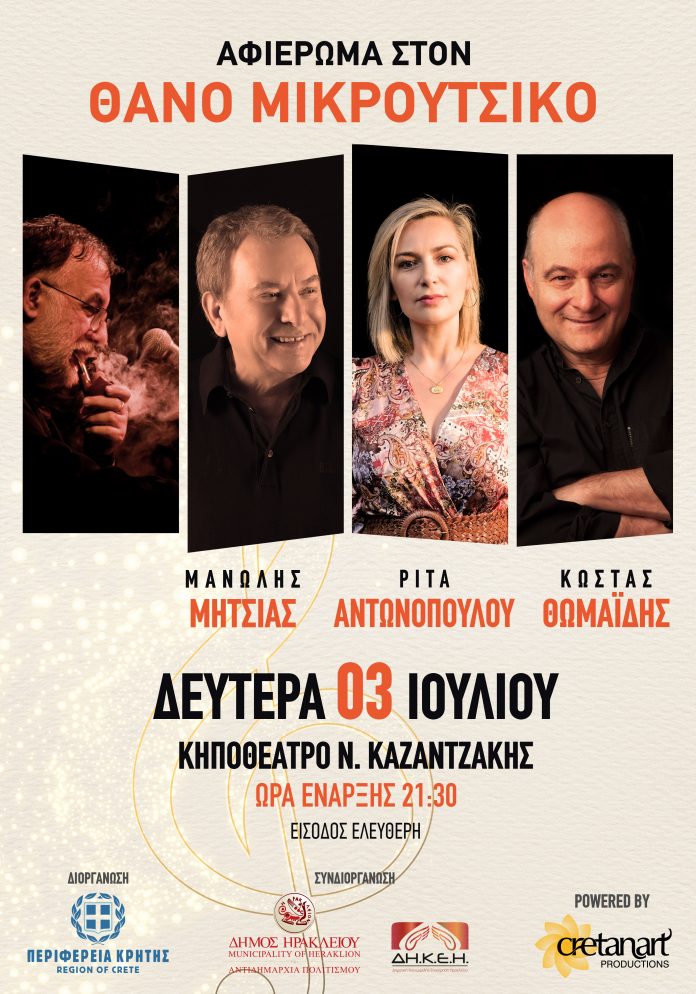 Η μουσική του Θάνου Μικρούτσικου ταξιδεύει στο Ηράκλειο της Κρήτης για μία συναυλία με τραγούδια από την πλούσια πορεία του. Τραγούδια που όλοι αγαπήσαμε θα ερμηνευτούν από σημαντικούς τραγουδιστές και σπουδαίους μουσικούς