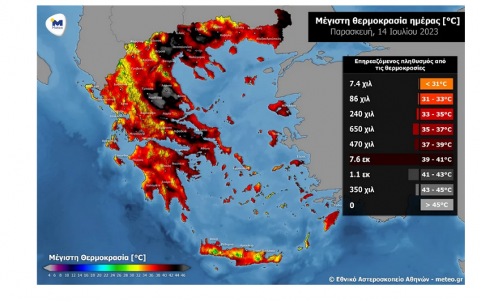 Σύμφωνα με τα προγνωστικά στοιχεία του Εθνικού Αστεροσκοπείου Αθηνών / meteo.gr, κατά την κορύφωση του κύματος καύσωνα αναμένεται στη χώρα την Παρασκευή 14/07, οι μέγιστες θερμοκρασίες θα φτάσουν τοπικά τους 42-43 βαθμούς Κελσίου. Αυτό θα έχει ως αποτέλεσμα την έκθεση του μεγαλύτερου μέρους του πληθυσμού σε πολύ υψηλές μέγιστες θερμοκρασίες.
