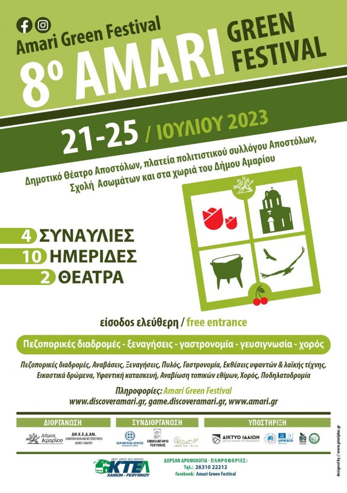 18:30 – 19:30: Πλατεία Πολιτιστικού Συλλόγου Αποστόλων: Ομιλία με θέμα «Δυνατότητα καλλιέργειας υποτροπικών φυτών (αβοκάντο, μάνγκο κά) στο Αμάρι». Ομιλητής: Δρ. Λιονάκης Σπύρος, καθηγητής του Ελληνικού Μεσογειακού Πανεπιστήμιο σε συνεργασία με το Ινστιτούτο Οικολογικής Γεωργίας ΔΗΩ.