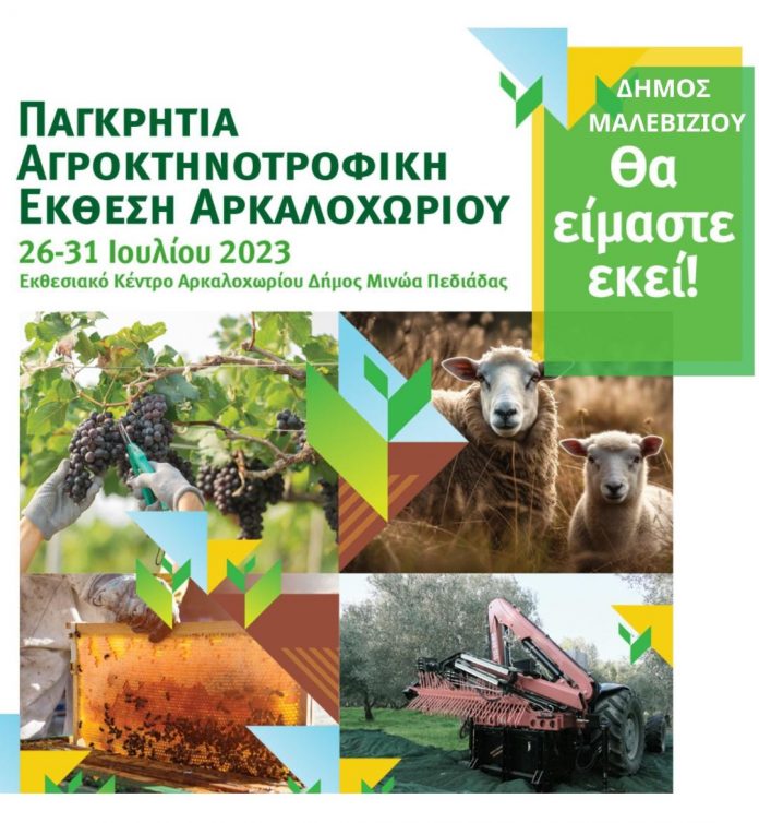Η έκθεση θα πραγματοποιηθεί από 26 έως 31 Ιουλίου στο Εκθεσιακό Κέντρο Αρκαλοχωρίου και η συμμετοχή του Δήμου Μαλεβιζίου εντάσσεται στις πρωτοβουλίες και δράσεις που στόχο έχουν την προβολή και ανάδειξη των τοπικών προϊόντων, τη στήριξη του πρωτογενή τομέα αλλά και την προβολή του τουριστικού προϊόντος, της φύσης και του περιβάλλοντος της περιοχής.