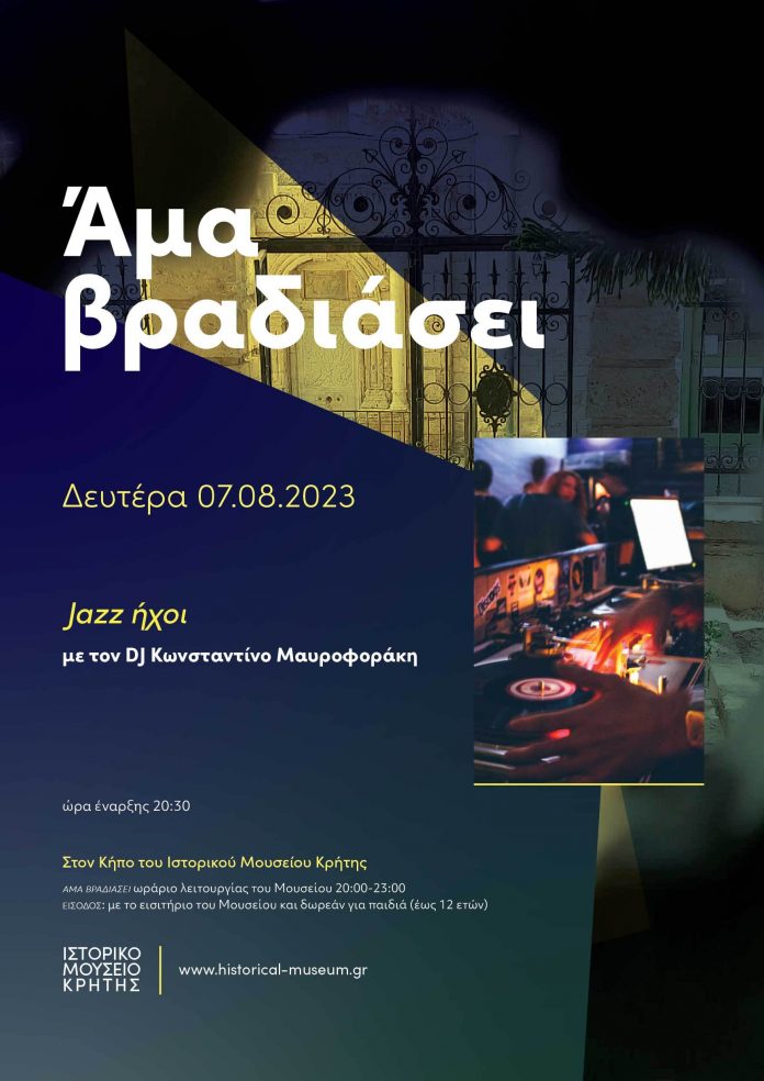 Ο Αύγουστος ξεκινάει με jazz διάθεση στο Άμα Βραδιάσει. Τη Δευτέρα 7 Αυγούστου, στις 20:30, στον Κήπο του Ιστορικού Μουσείου Κρήτης θα απολαύσουμε επιλογές jazz, αλλά και μουσική από τα 60s και τα 70s και από νέες κυκλοφορίες.