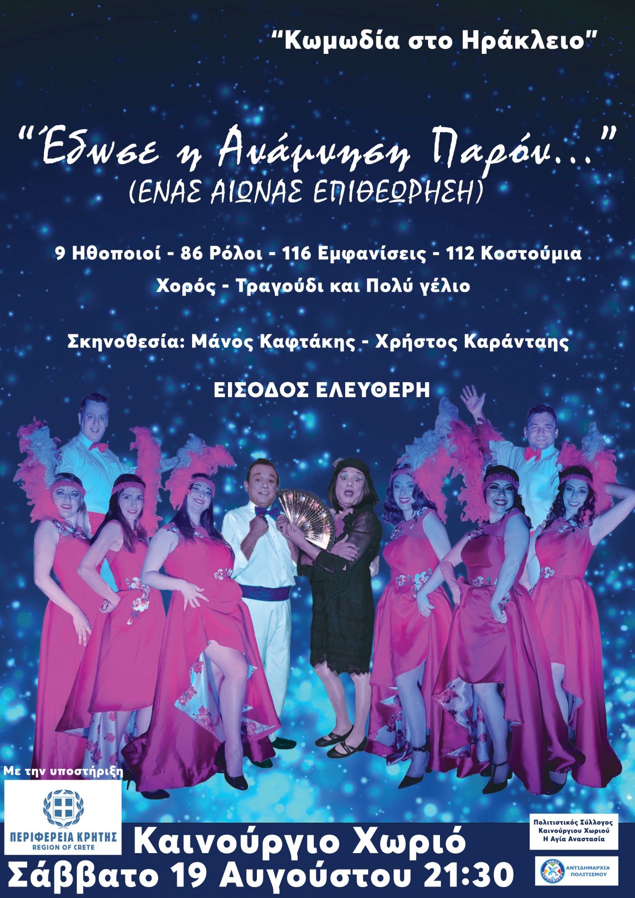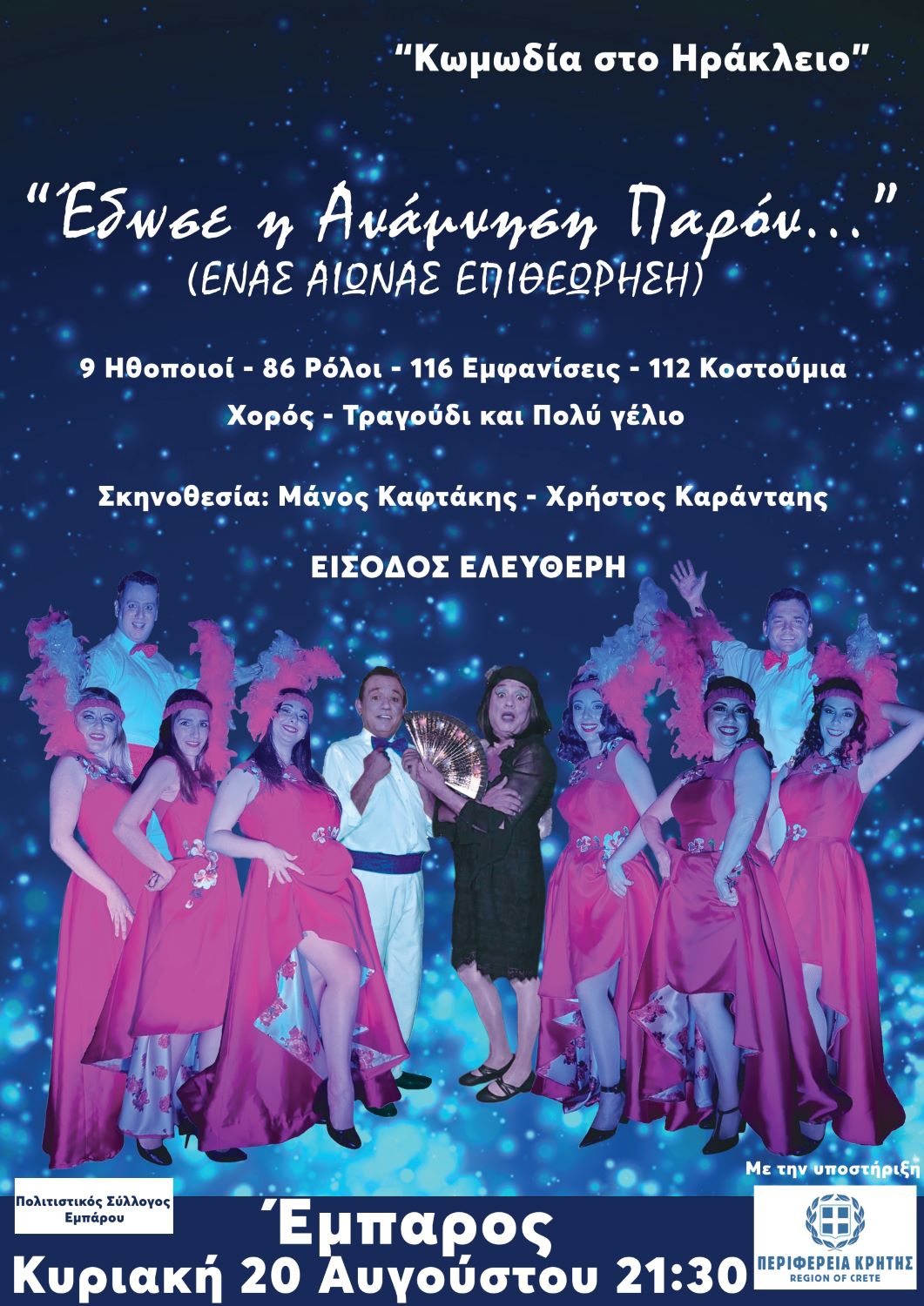 Μια διοργάνωση του Πολιτιστικού Συλλόγου Εμπάρου, σε συνδιοργάνωση με την Περιφέρεια Κρήτης. Η παράσταση είναι σε σκηνοθεσία των Μάνου Καφτάκη – Χρήστου Καράνταη. Η είσοδος είναι ελεύθερη για τους πολίτες.
