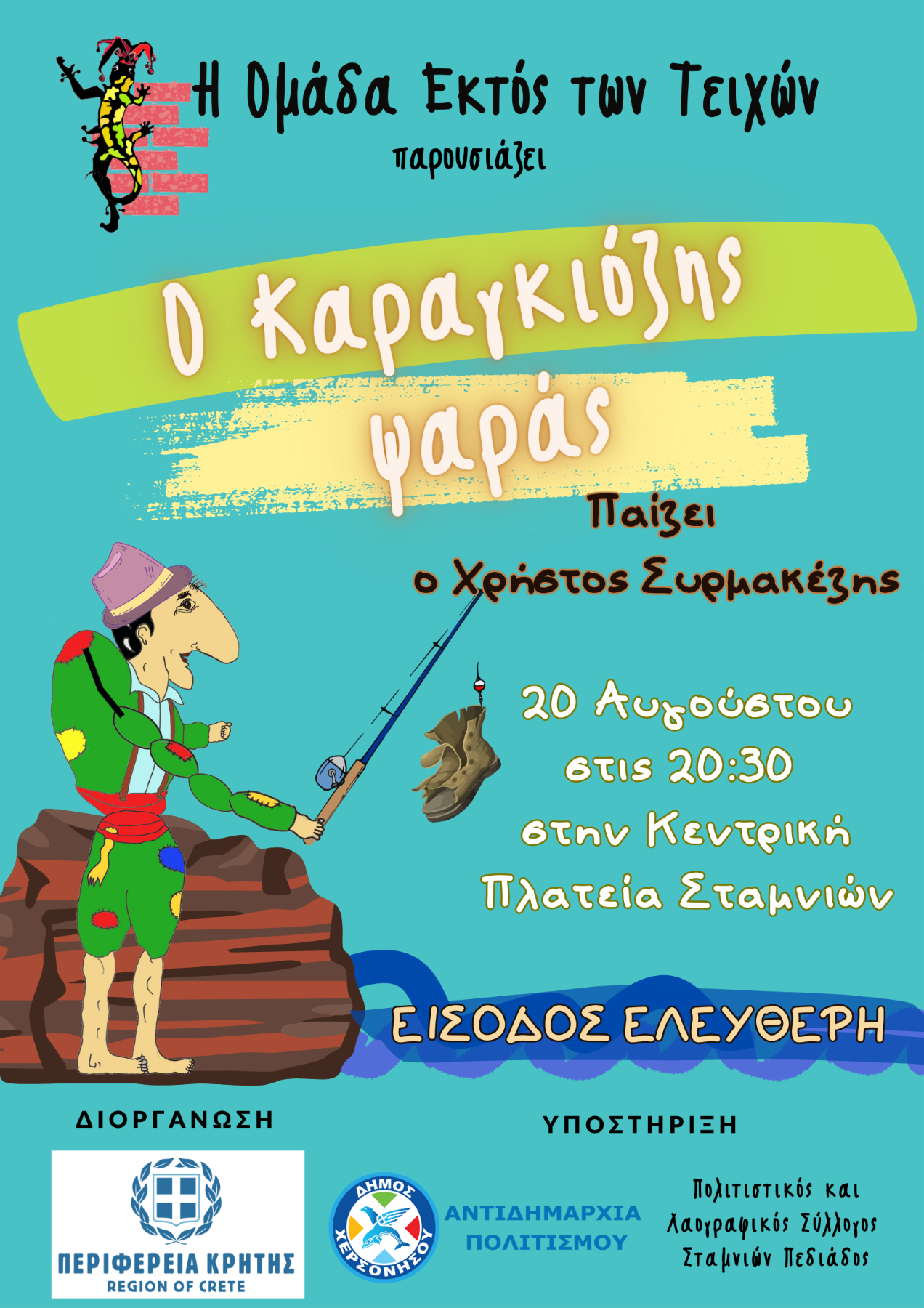 Την Κυριακή 20 Αυγούστου 2023 και ώρα 21:30 στην Κεντρική πλατεία, στους Σταμνιούς του Δήμου Χερσονήσου, θα παρουσιαστεί η παράσταση «Ο Καραγκιόζης Ψαράς» από την Ομάδα εκτός των Τειχών και τον παραδοσιακό θίασο σκιών του Χρήστου Συρμακέζη.