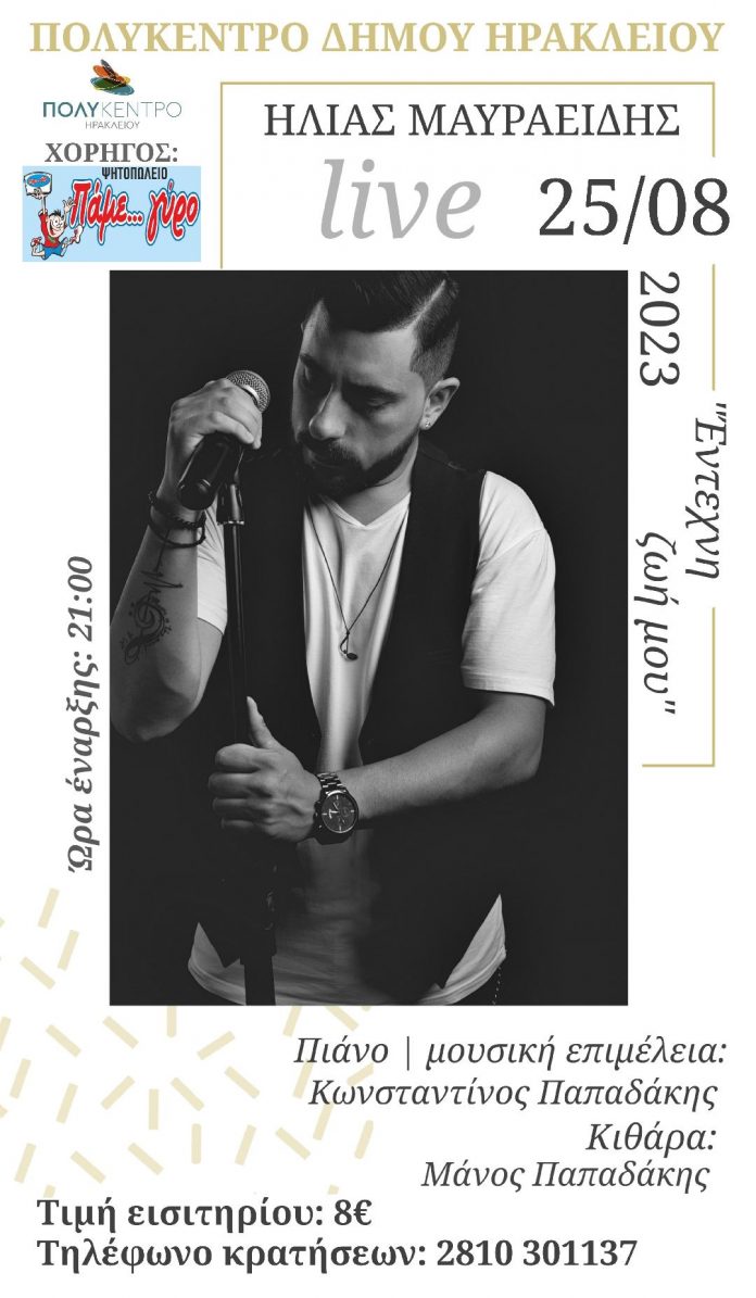 Ο Ηλίας Μαυραειδής έρχεται ξανά στο Πολυκέντρο Ηρακλείου την Παρασκευή 25 Αυγούστου στις 21:00, σε ένα μοναδικό live!