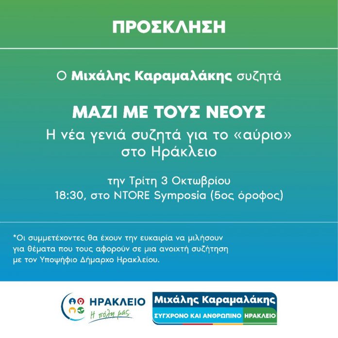 Μία συζήτηση εφ’ όλης της ύλης, αναφορικά με την επόμενη μέρα στο δήμο Ηρακλείου και το πως η νέα γενιά την οραματίζεται, αναμένεται να πραγματοποιήσει ο Υποψήφιος Δήμαρχος Ηρακλείου, Μιχάλης Καραμαλάκης, την Τρίτη 3 Οκτωβρίου στις 18:30 στο ΝTORE Symposia, στον 5ο όροφο.
