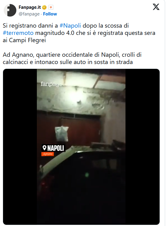 Ένας σεισμός μεγέθους 4,0 βαθμών ταρακούνησε χθες, Δευτέρα, την ηφαιστειακή περιοχή Campi Flegrei της Ιταλίας, δυτικά της Νάπολης, καθώς οι σοκαρισμένοι κάτοικοι δημοσίευσαν βίντεο με αυτοκίνητα που κατακλύζονται από συντρίμμια εν μέσω δονήσεων.