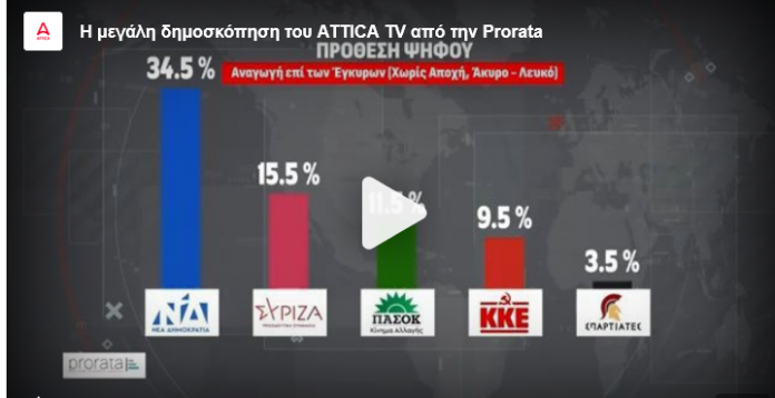 Ειδικότερα, η έρευνα της Prorata για τον Δήμο Αθηναίων, για λογαριασμό του τηλεοπτικού σταθμού Attica TV, εμφανίζει τον Κώστα Μπακογιάννη να συγκεντρώνει ποσοστό 38%, έναντι 14,5% του Κώστα Ζαχαριάδη, 9% του Χάρη Δούκα, 8,5% του Νίκου Σοφιανού και 8,5% του καταδικασμένου για διεύθυνση εγκληματικής οργάνωσης, Ηλία Κασιδιάρη.
