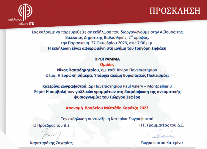 -Θα ακολουθήσει η ομιλία της κ. Κατερίνας Ζωγραφιστού με θέμα: «Η συμβολή των γαλλικών γραμμάτων στη διαμόρφωση της πνευματικής φυσιογνωμίας του Γιώργου Σεφέρη».
