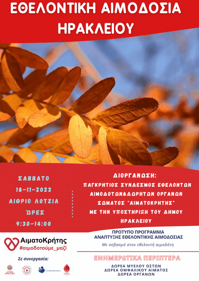 Εθελοντική αιμοδοσία θα πραγματοποιηθεί το Σάββατο 18/11/2023 στο κέντρο της πόλης του Ηρακλείου και συγκεκριμένα στο αίθριο της Λότζια από τις 9:30 έως τις 14:00.