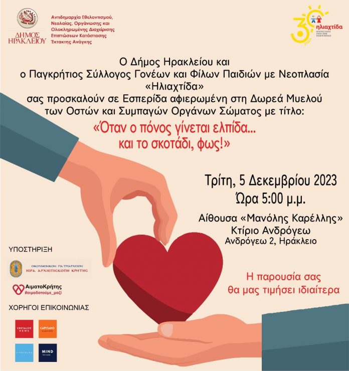 Παράλληλα, την Τρίτη 5 Δεκεμβρίου (17:00) στο Κτίριο Ανδρόγεω (αίθουσα «Μανόλης Καρέλλης», θα πραγματοποιηθεί ΕΣΠΕΡΙΔΑ με θέμα: «Όταν ο πόνος γίνεται ελπίδα… και το σκοτάδι, φως!». Στην εκδήλωση θα παρουσιάσουν το έργο τους ο Παγκρήτιος Σύλλογος Γονέων και Φίλων Παιδιών με Νεοπλασία «Ηλιαχτίδα» και ο Παγκρήτιος Σύνδεσμος Εθελοντών Αιμοδοτών & Δωρητών Οργάνων Σώματος «Αιματοκρήτης». Η εκδήλωση γίνεται με την Υποστήριξη της Ιεράς Αρχιεπισκοπής Κρήτης και του Παγκρήτιου Συνδέσμου «ΑιματοΚρήτης».