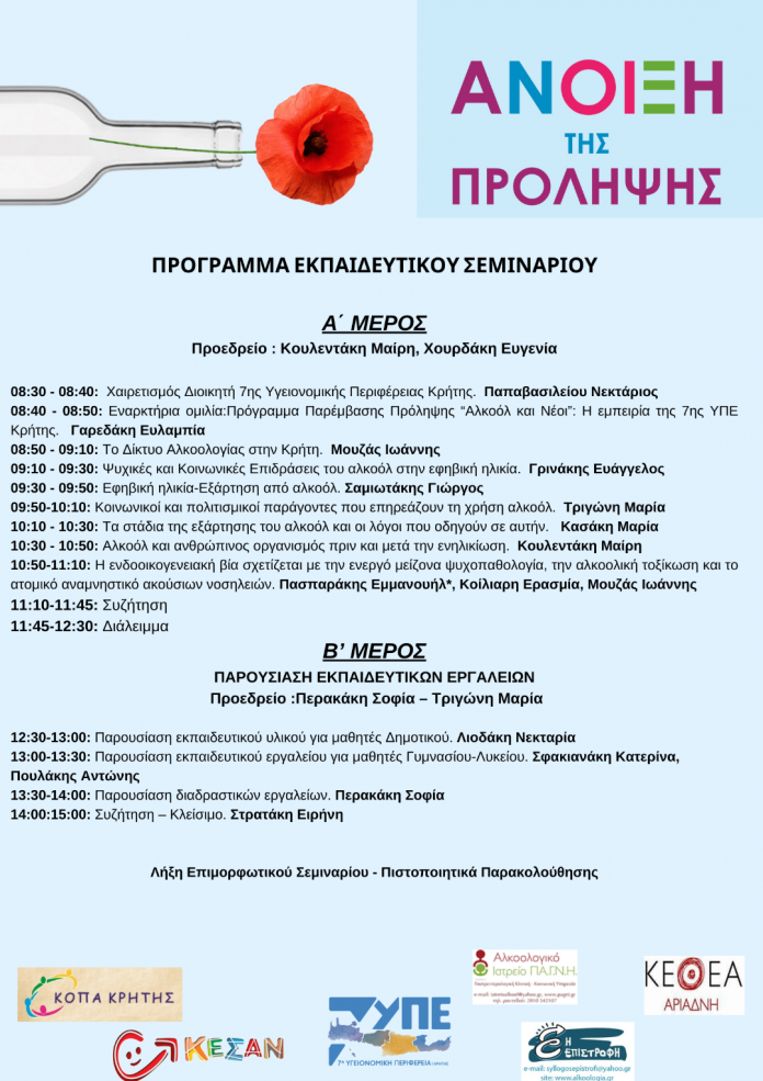 Η 7η Υγειονομική Περιφέρεια Κρήτης πραγματοποιεί την Τετάρτη 22 Μαΐου 2024 το τέταρτο κατά σειρά πανελλήνιο εκπαιδευτικό σεμινάριο πρόληψης, με θέμα «Αλκοόλ και Νέοι».