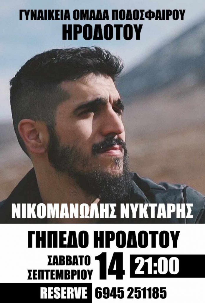 Η γυναικεία ομάδα ποδοσφαίρου του Ηρόδοτου διοργανώνει κρητική βραδιά, το Σάββατο 14 Σεπτεμβρίου, στο γήπεδο του συλλόγου της Ν. Αλικαρνασσού, με το Νικομανώλη Νύκταρη και το συγκρότημα του.