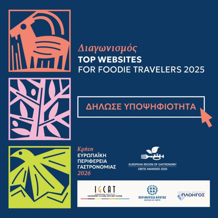 Στο πλαίσιο της συμμετοχής της Κρήτης ως Ευρωπαϊκή Περιφέρεια Γαστρονομίας 2026, στον διαγωνισμό “TOP WEBSITES FOR FOODIE TRAVELERS 2025” που διοργανώνεται από το Διεθνές Ινστιτούτο Γαστρονομίας, Πολιτισμού, Τεχνών και Τουρισμού (IGCAT), η Περιφέρεια Κρήτης απευθύνει πρόσκληση σε δημόσιους και ιδιωτικούς φορείς να υποβάλουν υποψηφιότητα με σκοπό τη βράβευση των ιστοσελίδων (websites) τους που πρέπει απαραιτήτως να σχετίζονται με τον γαστρονομικό πολιτισμό της Κρήτης.
