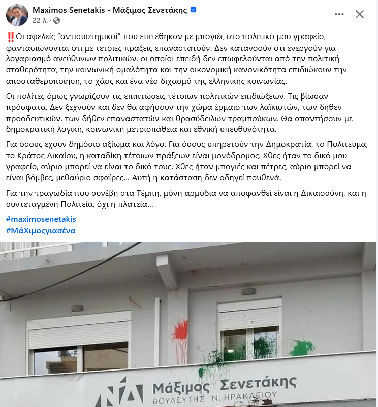 Ανάρτηση του Βουλευτή της Νέας Δημοκρατίας Μάξιμου Σενετάκη για την επίθεση στο πολιτικό του γραφείο: