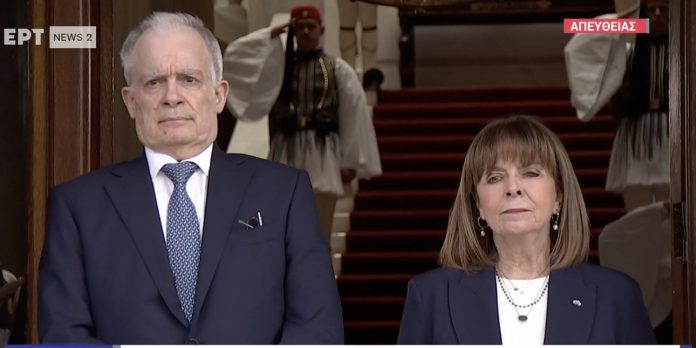 Εκεί τον υποδέχθηκε η απερχόμενη Πρόεδρος της Δημοκρατίας Κατερίνα Σακελλαροπούλου για τη τελετή παράδοσης-παραλαβής.