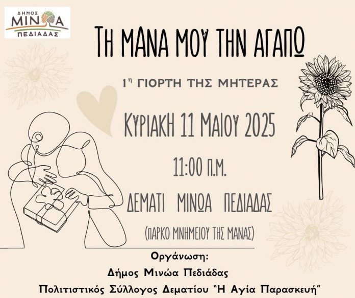 Ο Δήμος Μινώα Πεδιάδας και ο Πολιτιστικός Σύλλογος Δεματίου «Η Αγία Παρασκευή», διοργανώνουν την εκδήλωση, «Τη μάνα μου την αγαπώ», την Κυριακή 11 Μαΐου 2025, ημέρα της γιορτής της Μητέρας και ώρα 11:00 π.μ., στο πάρκο του Μνημείου της Μάνας στο Δεμάτι.
