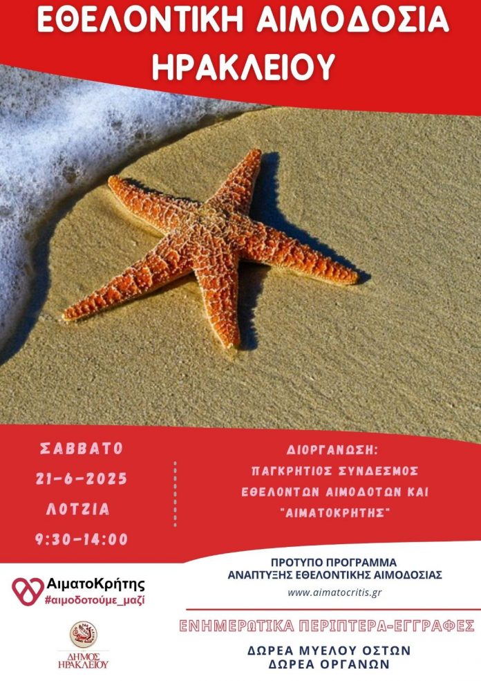 Η εθελοντική αιμοδοσία πραγματοποιείται κάθε Σάββατο. Πρόκειται για μια κοινή προσπάθεια αιμοδοσίας, την οποία διοργανώνει ο Παγκρήτιος Σύνδεσμος Εθελοντών Αιμοδοτών και Δωρητών Οργάνων Σώματος «Αιματοκρήτης, με τη στήριξη του Δήμου Ηρακλείου.