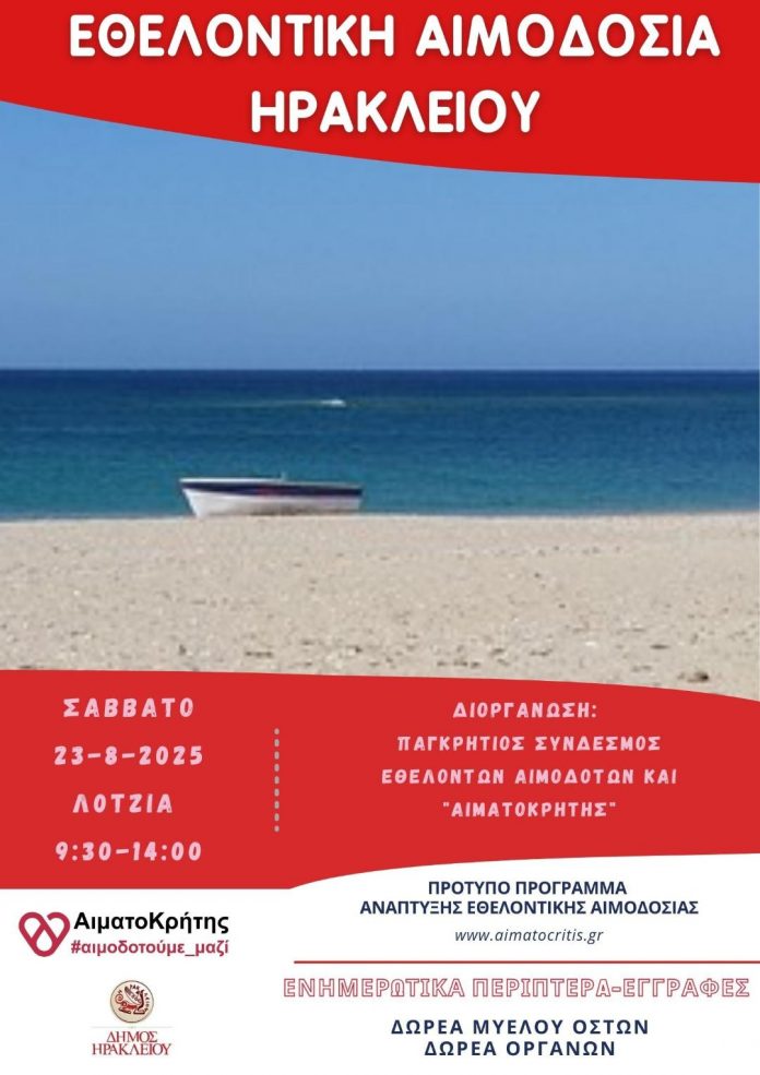 Το Σάββατο 23 Αυγούστου 2025 θα πραγματοποιηθεί εθελοντική αιμοδοσία στο κέντρο της πόλης του Ηρακλείου και συγκεκριμένα στο αίθριο της Λότζια από τις 09:30 έως τις 14:00. Η εθελοντική αιμοδοσία πραγματοποιείται κάθε Σάββατο.