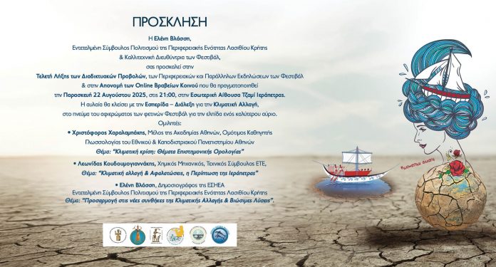 Την Παρασκευή 22 Αυγούστου 2025, στις 21:00, στην Εσωτερική Αίθουσα Τζαμί Ιεράπετρας, ολοκληρώνονται οι διαδικτυακές προβολές, οι περιφερειακές και οι παράλληλες εκδηλώσεις των Φεστιβάλ, με μια ξεχωριστή βραδιά αφιερωμένη στην Κλιματική Αλλαγή.