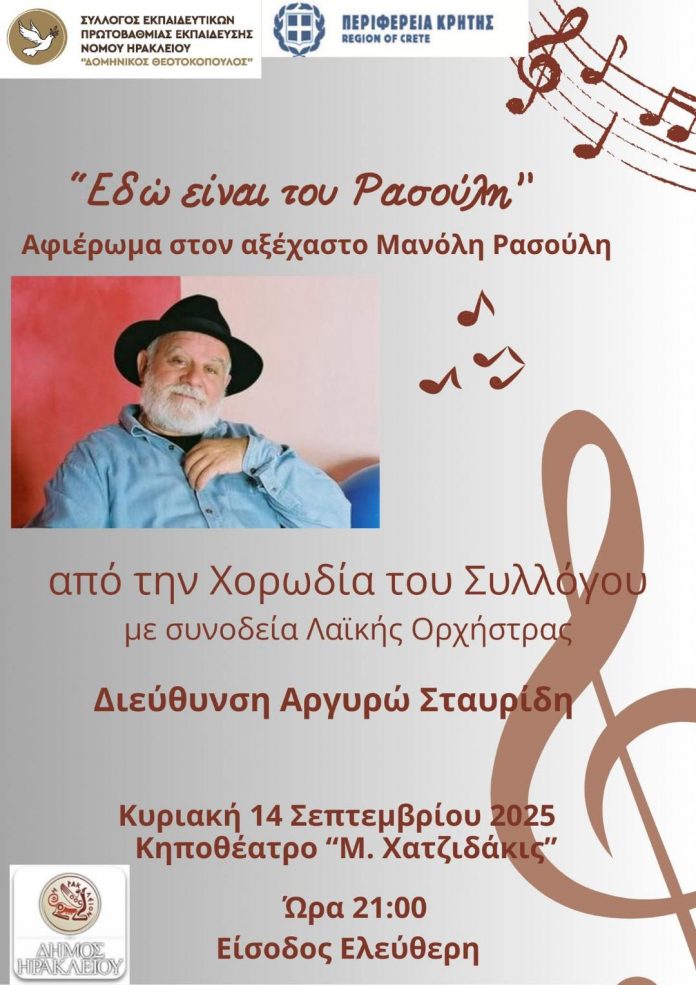 Η Ομάδα Χορωδίας του Συλλόγου Εκπαιδευτικών Π.Ε. «Δ. Θεοτοκόπουλος», πραγματοποιεί, με την υποστήριξη της Περιφέρειας Κρήτης, μουσικό αφιέρωμα, στον αξέχαστο στιχουργό και τραγουδιστή Μανόλη Ρασούλη. Τίτλος του αφιερώματος «Εδώ είναι του Ρασούλη…»,  και θα πραγματοποιηθεί την Κυριακή 14 Σεπτεμβρίου 2025 και ώρα 21:00μ.μ. στο κηποθέατρο «Μάνος Χατζηδάκις» με ελεύθερη είσοδο.