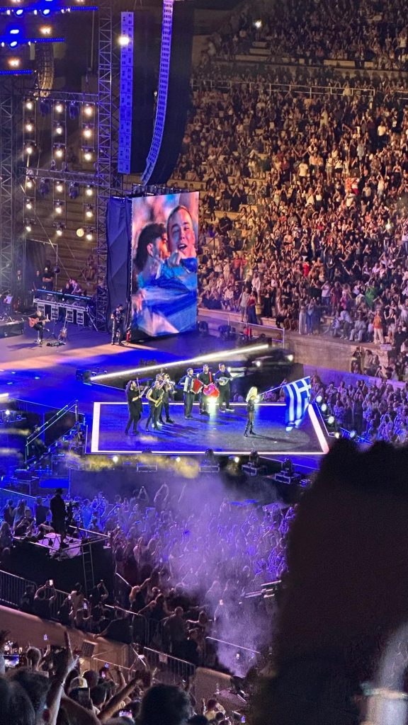 Με το κλίμα ενθουσιασμού να φτάνει στο αποκορύφωμα, η Άννα Βίσση ανέβηκε στη σκηνή κρατώντας μια ελληνική σημαία με κοντάρι, την οποία ύψωσε στον αέρα, προκαλώντας παραλήρημα στο Καλλιμάρμαρο.