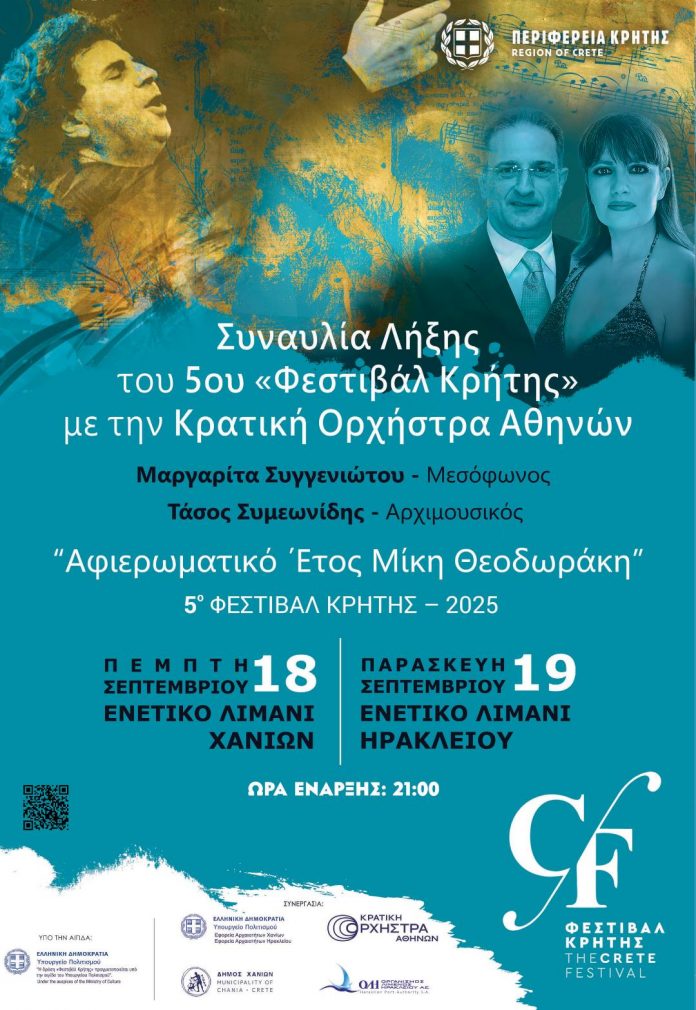 Το «Φεστιβάλ Κρήτης» της Περιφέρειας που αποτελεί ένα επιτυχημένο θεσμό στον Πολιτισμό τα τελευταία πέντε χρόνια στο νησί, ολοκληρώνει την φετινή του διοργάνωση με αφιέρωμα στον Παγκόσμιο Κρητικό Μίκη Θεοδωράκη, φιλοξενώντας την Κρατική Ορχήστρα Αθηνών. Με δύο δωρεάν στους πολίτες της Κρήτης συναυλίες με κοινή ώρα έναρξης στις 9 μ.μ. στις 18 Σεπτεμβρίου στο Ενετικό λιμάνι Χανίων και 19 Σεπτεμβρίου στο Ενετικό λιμάνι Ηρακλείου, «πέφτει» η αυλαία του φεστιβάλ για φέτος. Η κρατική ορχήστρα έχοντας μεγάλη αποδοχή στην Ελλάδα και διεθνή αναγνώριση, στις δύο συναυλίες της στην Κρήτη θα είναι υπό τη διεύθυνση του μαέστρου Τάσου Συμεωνίδη, και θα παρουσιάσει έργα του Θεοδωράκη που σφράγισαν τη συλλογική μνήμη. Η συναυλία, σύμφωνα με τα οργανωτικά στελέχη της Περιφέρειας αποτελεί έναν ύμνο στην τέχνη, στην ελευθερία και στην πολιτιστική ταυτότητα της Ελλάδας, όπως ακριβώς τα υπηρέτησε ο Μίκης Θεοδωράκης σε όλη του τη ζωή.