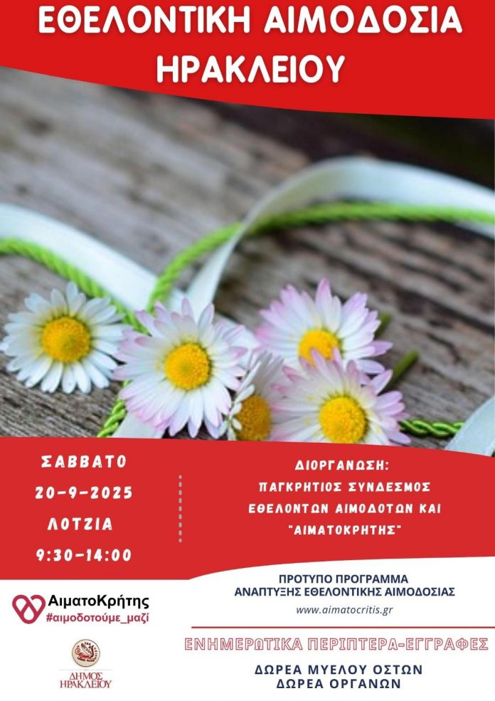 Το Σάββατο 20 Σεπτεμβρίου 2025 θα πραγματοποιηθεί εθελοντική αιμοδοσία στο κέντρο της πόλης του Ηρακλείου και συγκεκριμένα στο αίθριο της Λότζια από τις 09:30 έως τις 14:00. Η εθελοντική αιμοδοσία πραγματοποιείται κάθε Σάββατο.