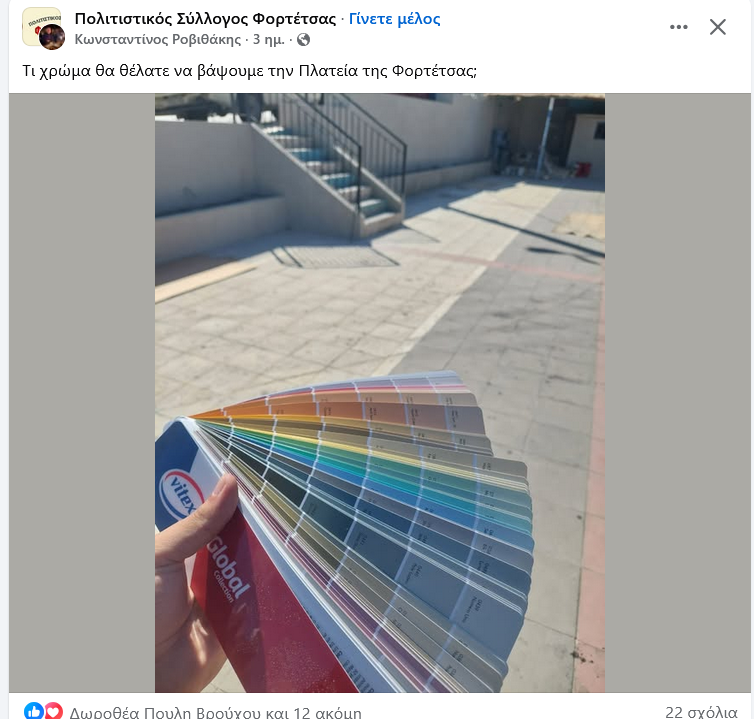Με μια ανάρτηση στα μέσα κοινωνικής δικτύωσης ο πολιτιστικός Σύλλογος Φορτέτσας καλεί τους κατοίκους της περιοχής να επιλέξουν το χρώμα το οποίο επιθυμούν για την πλατεία τους!