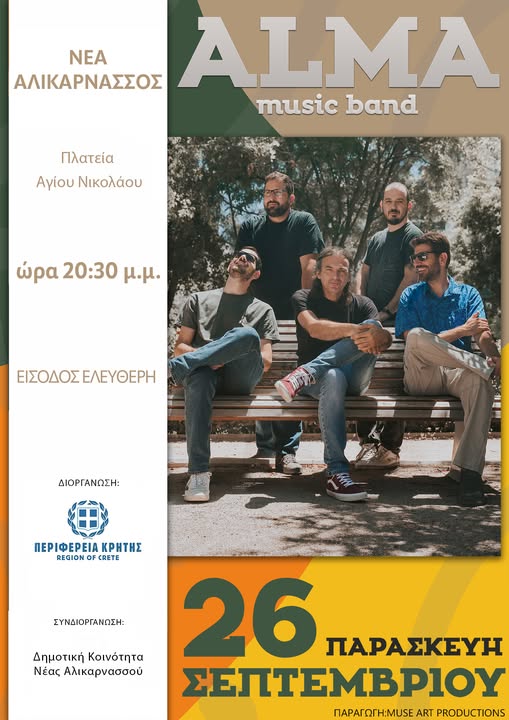 Η Δημοτική Κοινότητα Νέας Αλικαρνασσού, σε συνεργασία με την Περιφέρεια Κρήτης, συνδιοργανώνουν μια ξεχωριστή μουσική βραδιά με τους ALMA music band, την Παρασκευή 26 Σεπτεμβρίου στις 20:30 στην Πλατεία Αγίου Νικολάου.
