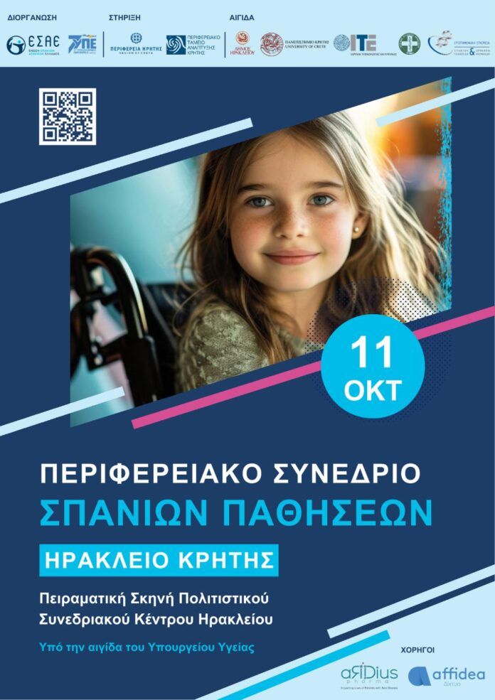 Η Ένωση Σπανίων Ασθενών Ελλάδος (Ε.Σ.Α.Ε.) και η 7η Υγειονομική Περιφέρεια Κρήτης, με την υποστήριξη της Περιφέρειας Κρήτης και του Περιφερειακού Ταμείου Ανάκαμψης Κρήτης, διοργανώνουν το 2ο Περιφερειακό Συνέδριο Σπανίων Παθήσεων, στις 11 Οκτωβρίου 2025, στην Πειραματική Σκηνή του Πολιτιστικού Συνεδριακού Κέντρου Ηρακλείου.