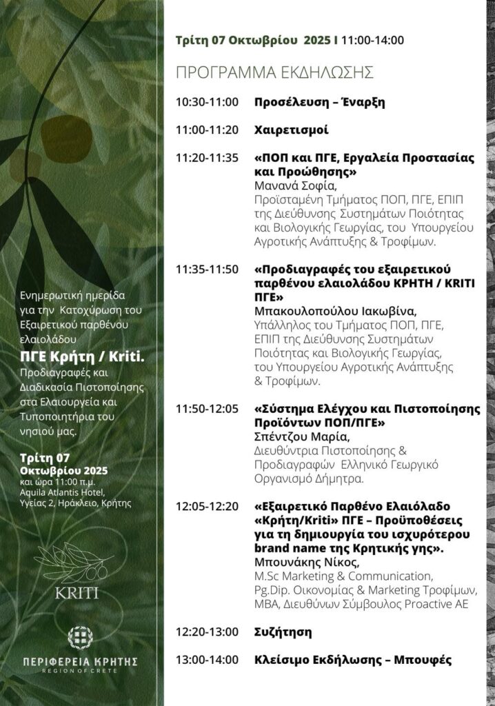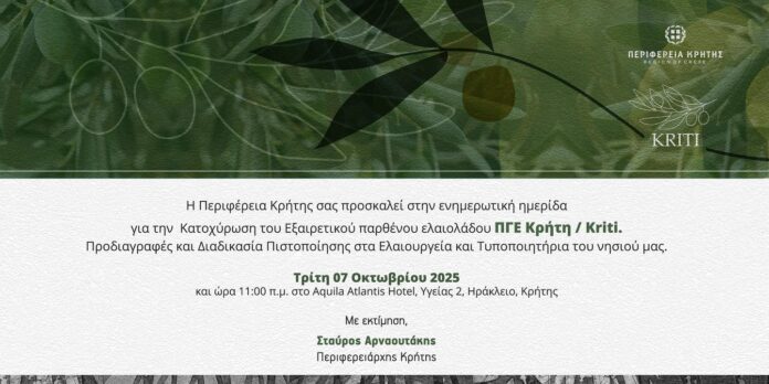 Η Περιφέρεια Κρήτης σας προσκαλεί σε μια ξεχωριστή ημερίδα αφιερωμένη στο Εξαιρετικό Παρθένο Ελαιόλαδο ΠΓΕ Κρήτη / Kriti, την Τρίτη 7 Οκτωβρίου 2025, στις 11:00 π.μ., στο ξενοδοχείο Aquila Atlantis στο Ηράκλειο.