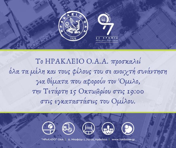 Το ΗΡΑΚΛΕΙΟ Ο.Α.Α. προσκαλεί όλα τα μέλη και τους φίλους του σε ανοιχτή συνάντηση για θέματα που αφορούν τον Όμιλο.