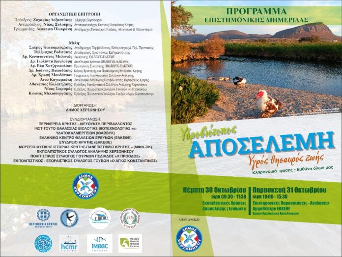 «Υδροβιότοπος Αποσελέμη – Υγρός θησαυρός ζωής. Κληρονομιά φύσης – Ευθύνη όλων μας» είναι ο τίτλος επιστημονικής διημερίδας που διοργανώνουν ο Δήμος Χερσονήσου, σε συνεργασία με την Περιφέρεια Κρήτης, το Ελληνικό Κέντρο Θαλάσσιων Ερευνών – ΕΛΚΕΘΕ, το Ινστιτούτο Θαλάσσιας Βιολογίας, Βιοτεχνολογίας και Υδατοκαλλιεργειών (ΙΘΑΒΒΥΚ), το Ενυδρείο Κρήτης, το Μουσείο Φυσικής Ιστορίας Κρήτης, καθώς και τους Πολιτιστικούς Συλλόγους Ανάληψης, Γουρνών και Γουβών.