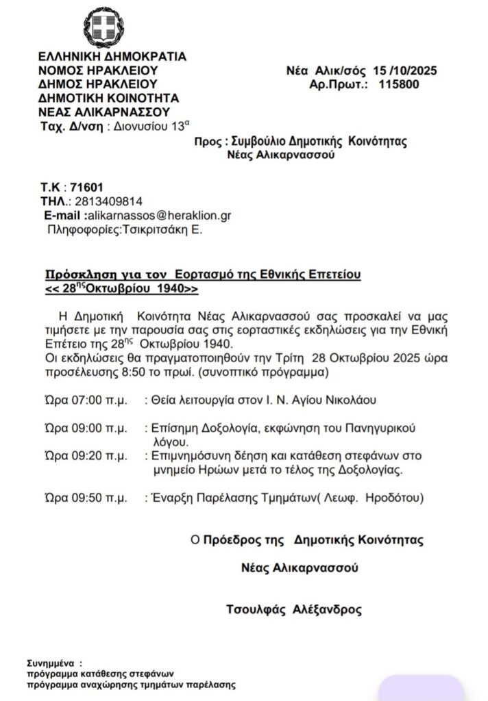 Ο εορτασμός της επέτειου του “Όχι” θα πραγματοποιηθεί στην Κοινότητα Αλικαρνασσού με ιδιαίτερη λαμπρότητα και συγκίνηση.